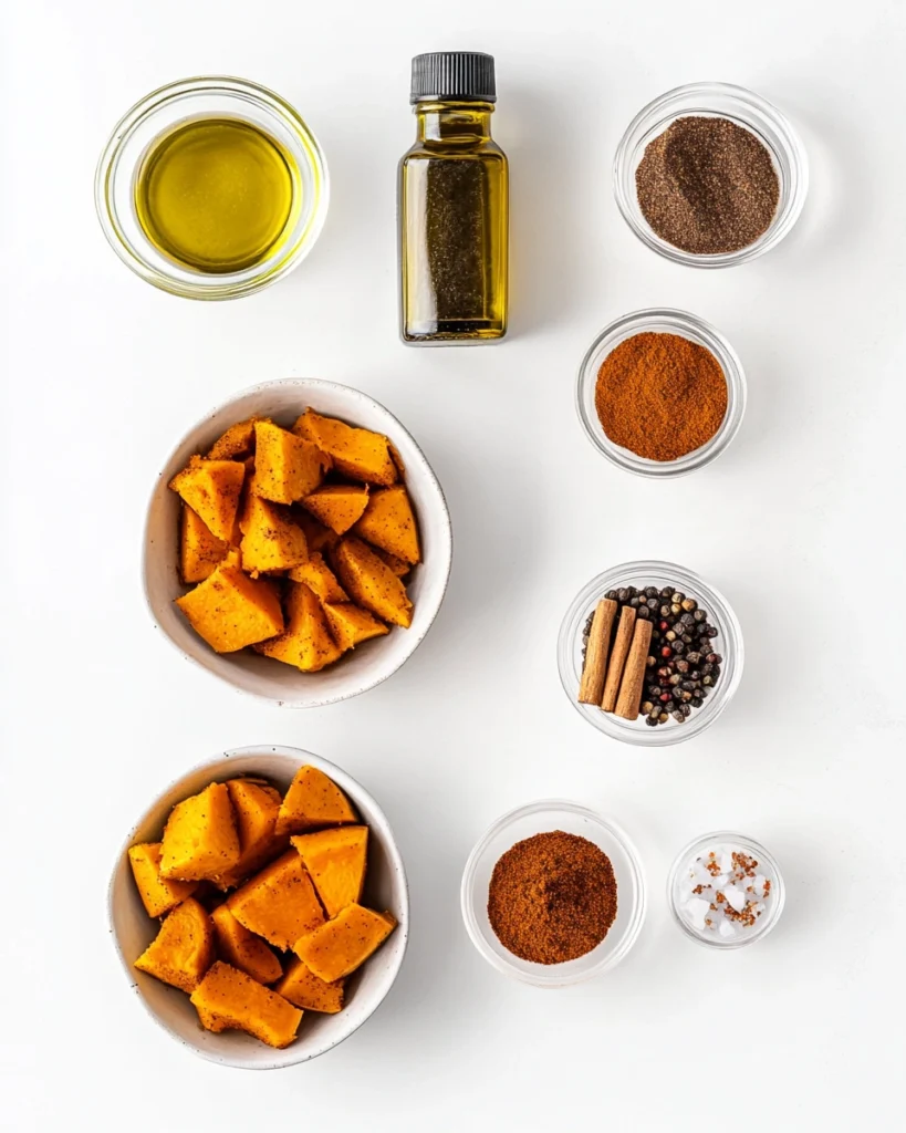 In a large bowl I toss the pumpkin cubes with olive oil cinnamon nutmeg paprika garlic powder salt and black pepper. I make sure every piece is well coated.