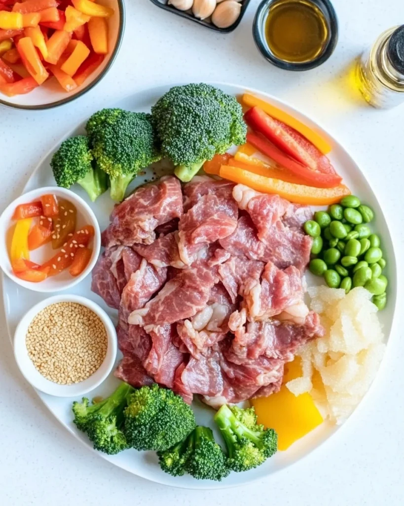 I start by tossing the beef slices in a little soy sauce cornstarch and sesame oil. I let it sit for 10–15 minutes while prepping everything else. This makes the beef extra tender and flavorful.