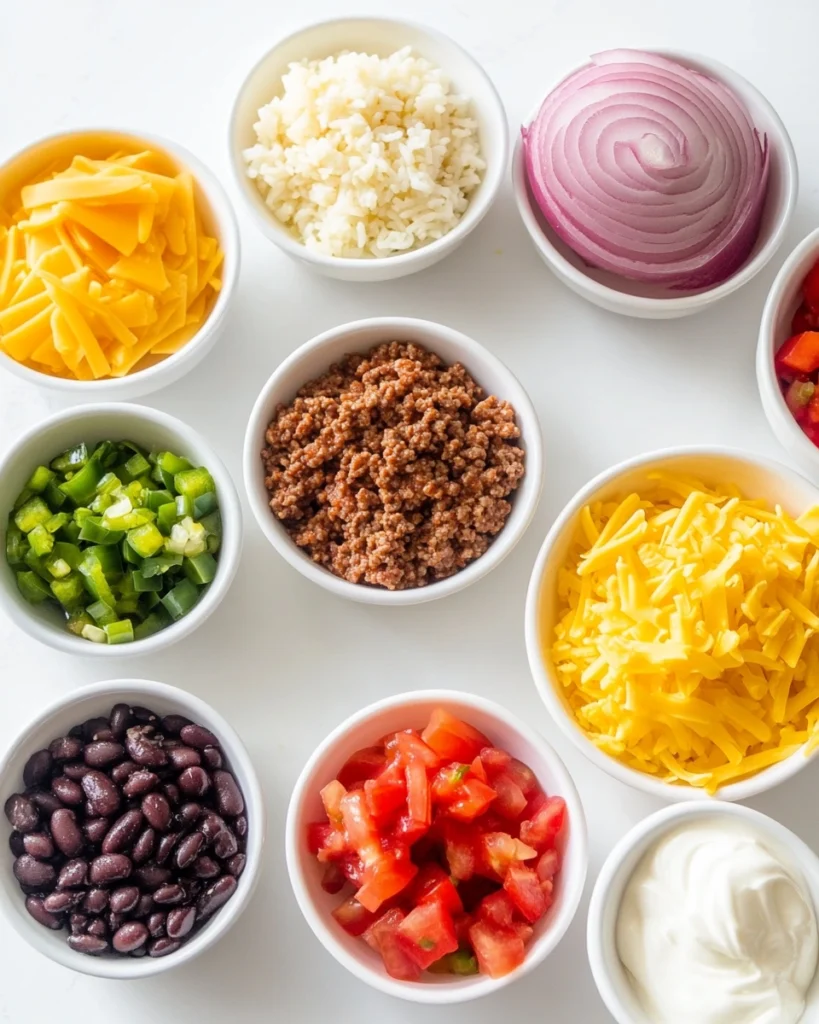 - Ground beef – Forms the savory base and adds hearty flavor.