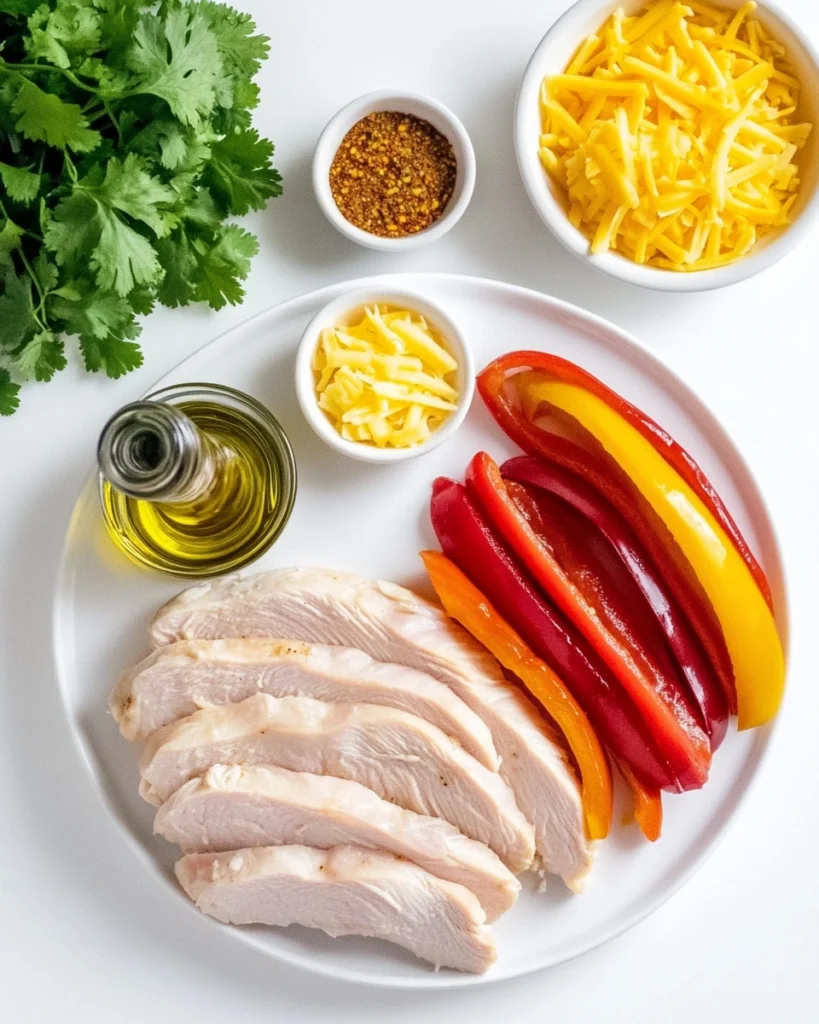 I slice the chicken breast into thin strips and cut the bell peppers and onion into similar-sized strips. Then, I toss everything in a mixing bowl with olive oil and fajita seasoning until well coated.