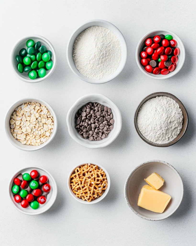 They’re loaded with peanut butter oats chocolate chips and holiday M&Ms giving them a chewy colorful and festive twist perfect for Christmas.