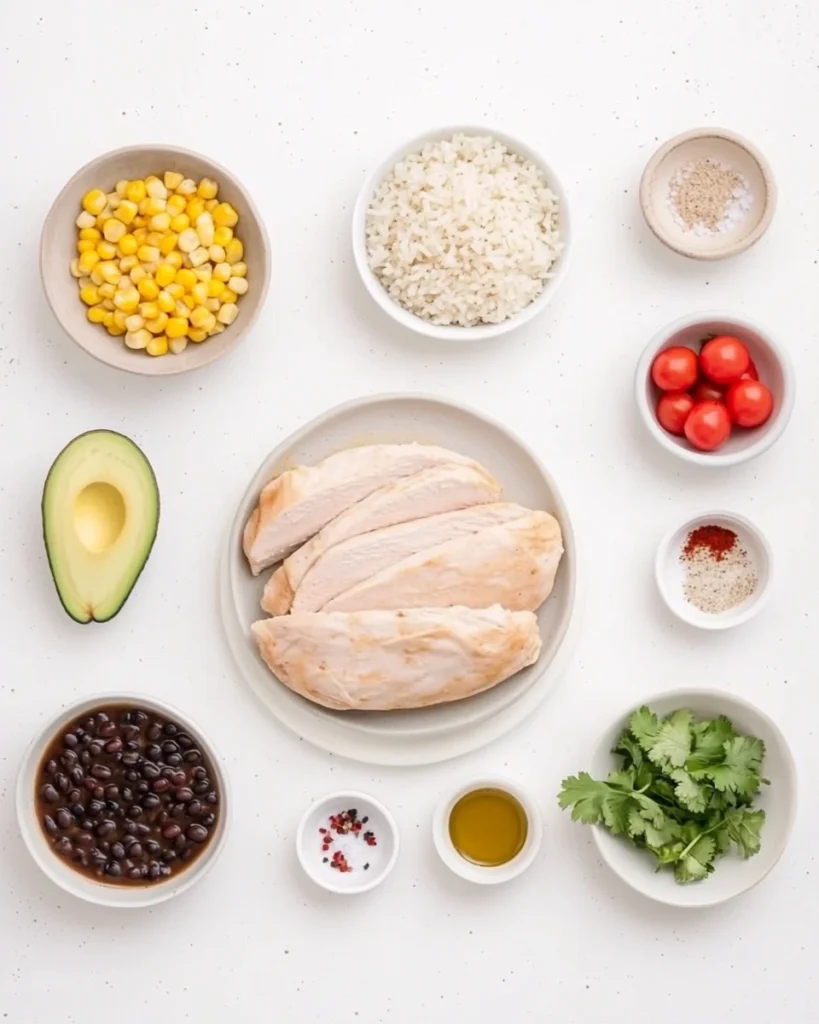 - Assemble bowls with rice as the base, then arrange beans, corn, tomatoes, and avocado.