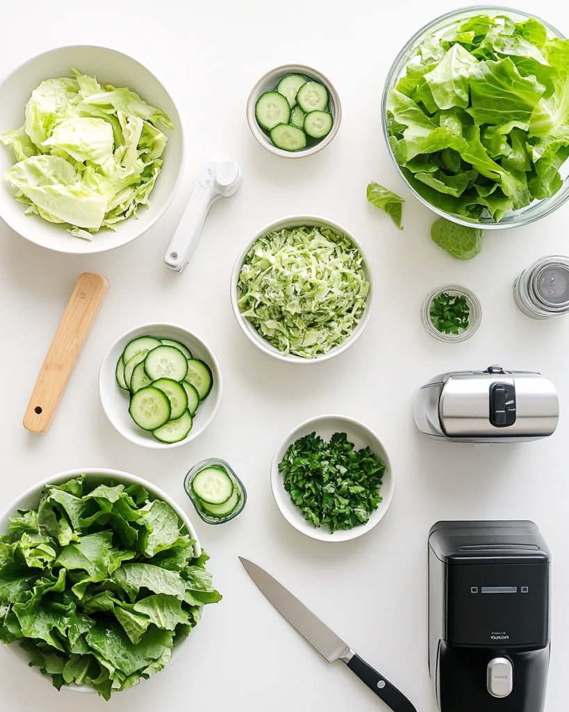 - Sharp knife – To chop the lettuce and cucumbers evenly and finely.