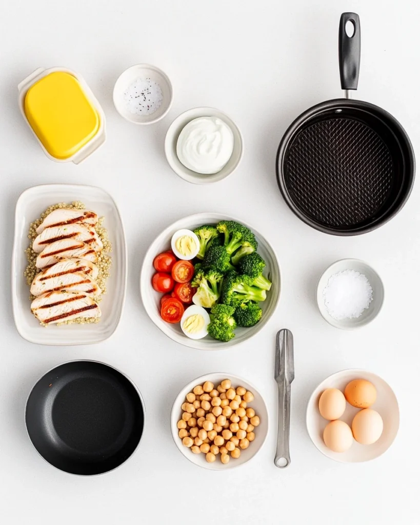 - Assemble bowl with quinoa, chicken, eggs, broccoli, chickpeas, tomatoes, and dressing.