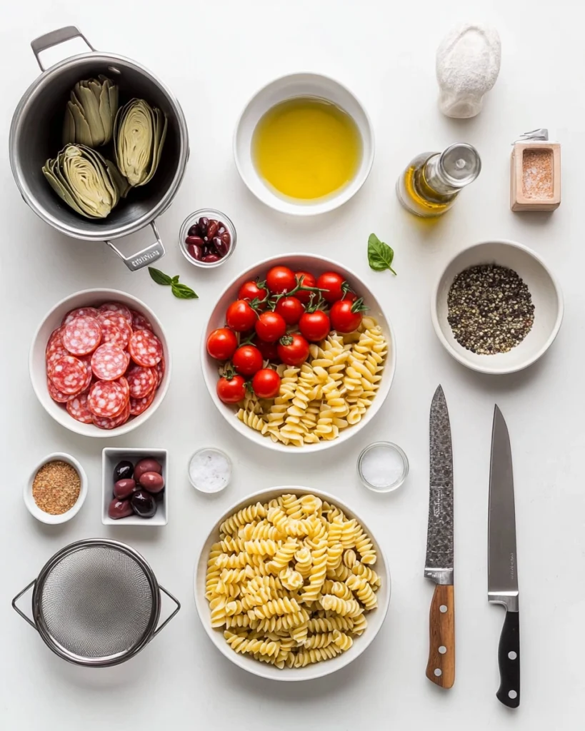 In a large bowl or platter, combine the cooled pasta, halved cherry tomatoes, salami coins, artichoke pieces, olives, and mozzarella.
