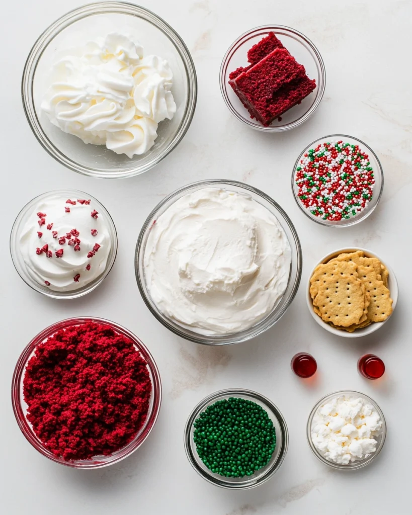 - Red velvet cake – Adds bold festive color and a soft and moist base layer.